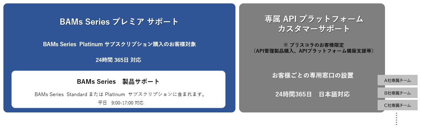 ブリスコラは、このような背景を受け、これまでのサブスクリプションに含まれる製品サポートに加えて24時間365日対応のプレミアサポートやお客様ごとの専属サポート等、お客様のAPI活用環境に合わせて選択ができるよう複数のサポートメニューを用意し、お客様にとっての最適解となるようAPI管理製品の提供と導入後の運用支援を包括的に提供できるよう体制を整えました。