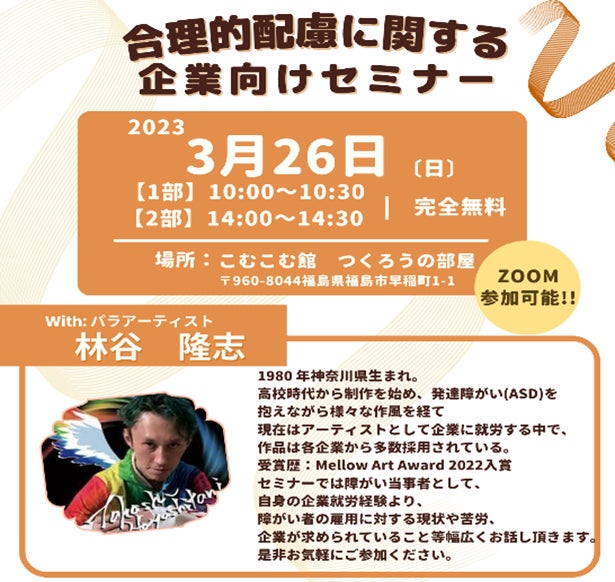 イベントは2部構成で企業向けセミナーとアートワークショップを実施します。セミナーは、現在障がい者アーティストとして活躍中の林谷隆志氏が、企業における合理的配慮の必要性や具体的な配慮事項をテーマに登壇いたします。 アートワークショップでは、福島県内の福祉事務所に通う障がいのある方が集まり、全員で一つのアートを制作します。作品は県内の施設に掲示される予定です。