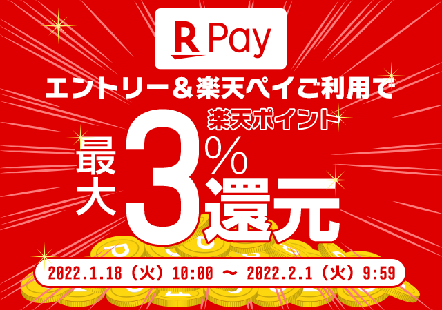 キャンペーン期間中にエントリー&楽天ペイ(オンライン決済)をご利用の上、商品をご購入いただいた楽天会員様に、商品の購入額に対して通常の楽天ポイント付与分(楽天ポイント払い・楽天キャッシュ払いご利用の場合、100円につき1ポイント)に加えて、特典ポイントとして購入額に対して楽天ポイント2%分を差し上げます。