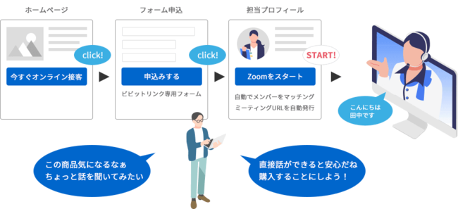 ZoomやGoogleカレンダー、Microsoftのアプリケーション等の「いつも利用しているツール」を連携させることで、オンライン商談で手間のかかる作業をすべて自動化して、スピーディで効果的なオンライン商談をおこなうことができます。 Webサイトやメール経由でのオンライン商談の受付やカスタマーサポートなど、幅広い用途で活用頂いています。( https://vivitlink.com/ )