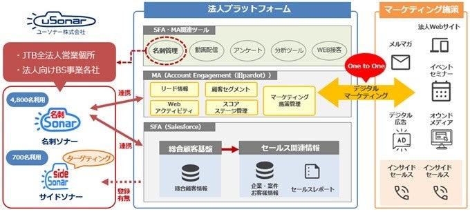日本最大の企業データベース※「LBC」を活用してDX実現を支援するユーソナー株式会社(旧社名:株式会社ランドスケイプ、本社:東京都新宿区、代表取締役社長:長竹 克仁、以下 ユーソナー)は、株式会社JTBに対しましてセールスフォース・ジャパン社のSalesforce及びAccount Engagement(旧 Pardot)と連携できる名刺管理アプリ「名刺ソナー(名刺Sonar)」と、リードジェネレーション強化ツール「サイドソナー(sideSonar)」を提供したことをお知らせします。