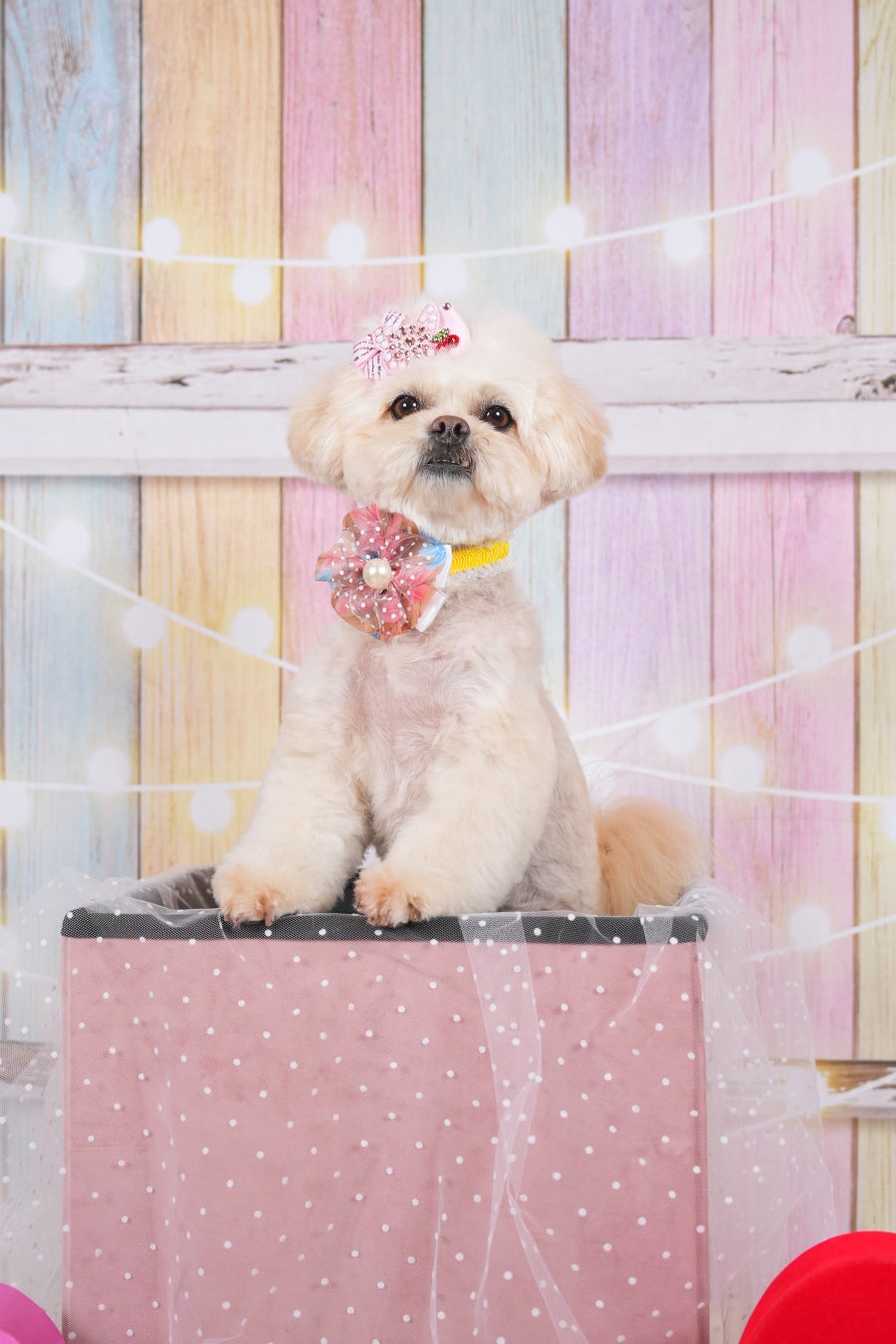 車両スタジオ登場。可愛い背景のフォトブースでプロの写真家によるわんちゃん撮影会を開催します。撮影した写真は、写真データのほか、カレンダー、アルバムなどにアレンジしたグッズとして、後日インターネット写真販売システムでご購入いただけます。