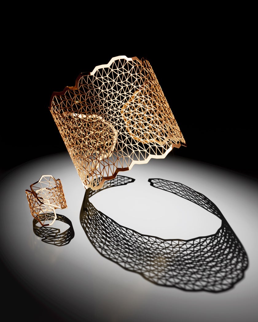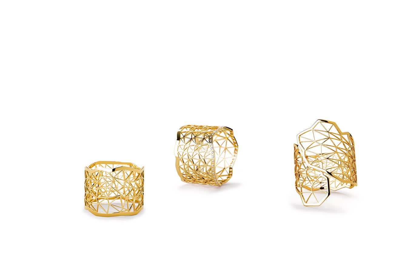 生き生きとした模様や形を紡ぎ出す「ニーシング・トピア ビジョン」。表情豊かなフォルムがジュエリーに独特の躍動感を与え、光沢のある表面が光を反射し、周囲の色彩を取り込みます。本来はずっしりと重量感のあるゴールドがまるで溶けているかのように周囲の光と反応してシャボン玉のように煌めきます。