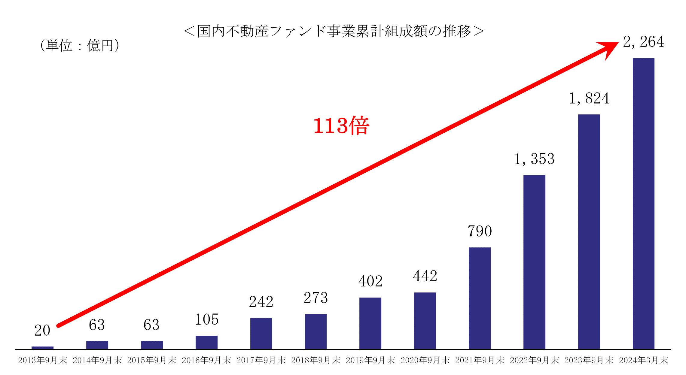 今般、「組成用不動産(Premium Asset Series)の取得完了のお知らせ」にてお知らせした通り、2024年3月29日付けで東京都中央区銀座六丁目の商業用不動産「GINZA SIX」の11階フロア全体を取得しました。その結果、国内不動産ファンド事業の累計組成額が2,000億円を突破し、2013年7月の事業開始以来、11年間で113.2倍に拡大いたしました。