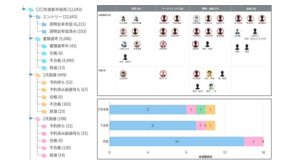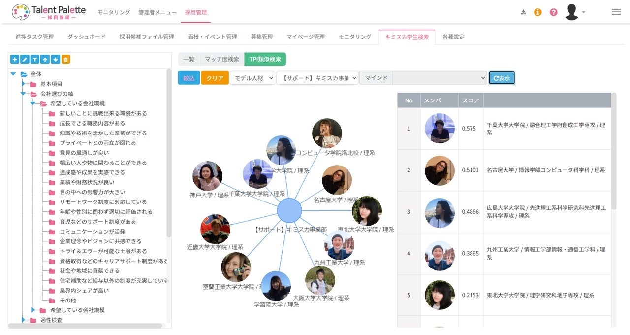 また企業の学生検索の精度向上、人材データの分析機能の拡充により、将来の活躍人材の発見とアプローチが可能になります。新たに加わった採用管理機能によって、キミスカは学生と出会うためのツールから、入社までの全てのプロセスを包括して管理できるツールへ。更に今年度から連携をしたタレントマネジメントシステムの『タレントパレット』にて入社後も継続的に人材データを蓄積していくことで、次世代の活躍人材の採用、育成を実現します。
