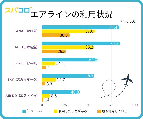 「ANA(全日空)」「JAL(日本航空)」はいずれも認知8割以上、利用経験5割以上占めています。