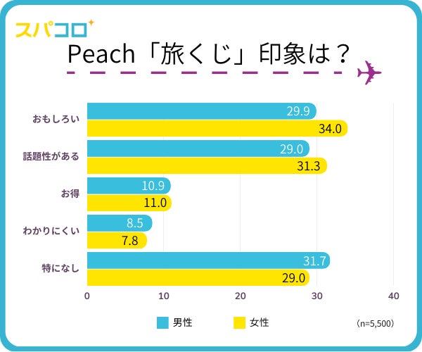 - 話題になったPeachの旅くじの印象で最も高いのは「おもしろい」で約3割。