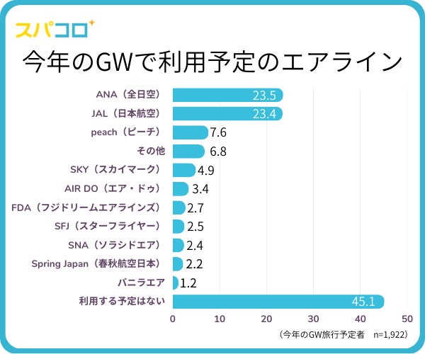 今年のGWで利用予定のエアラインは国内2大航空会社である「JAL(日本航空)」「ANA(全日空)」が2割以上でした。次いで3位にLCCの「peach(ピーチ)」が続いています。一方で「利用する予定はない」は45%で、半数以上が今年のGWに飛行機を利用することがわかりました。