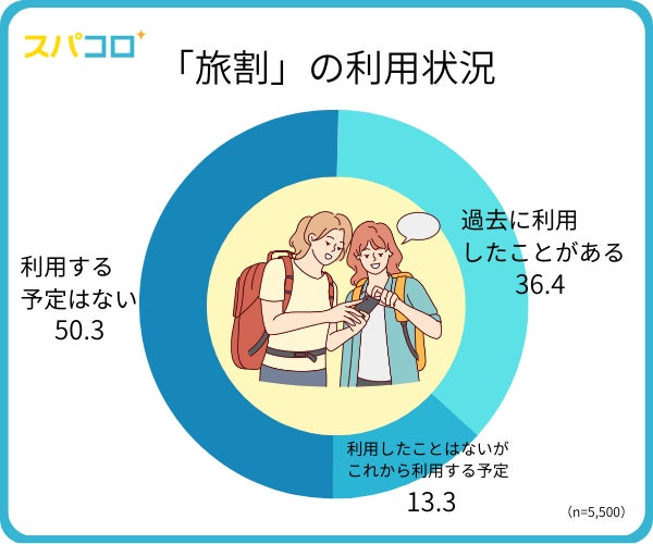 旅割の利用状況を聞いたところ、「過去に利用したことがある」(36.4%)「利用したことはないが、これから利用する予定」(13.3%)で約半数が利用済または利用予定という結果になりました。