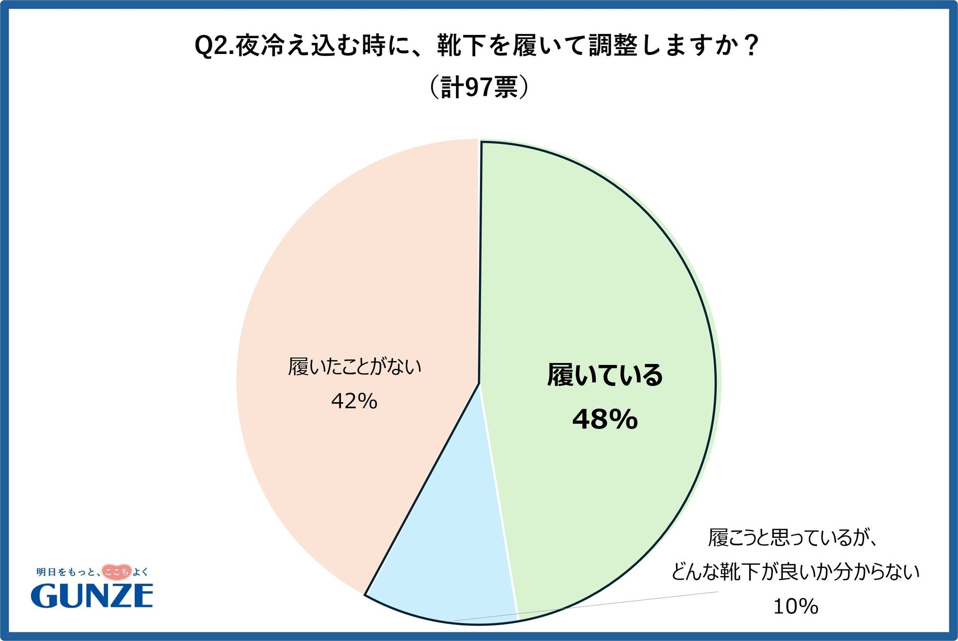 そんな中、まず手軽に寒さ対策ができるアイテムとして注目されるのが「靴下」です。グンゼ公式X(旧Twitter)で実施した睡眠時の靴下に関する調査では、「寝る時に靴下を履いて調整する」と回答した人が48%で、「何を履いていいかわからないが調整したい」と回答した人が10%と、靴下で調整したいと思っている方が過半数を占める結果となりました。一方で、「寝るときの靴下選びで迷うポイント」は人それぞれ違うようです。季節の変わり目の快眠には、寝具だけでなく靴下選びもカギになりそうです。