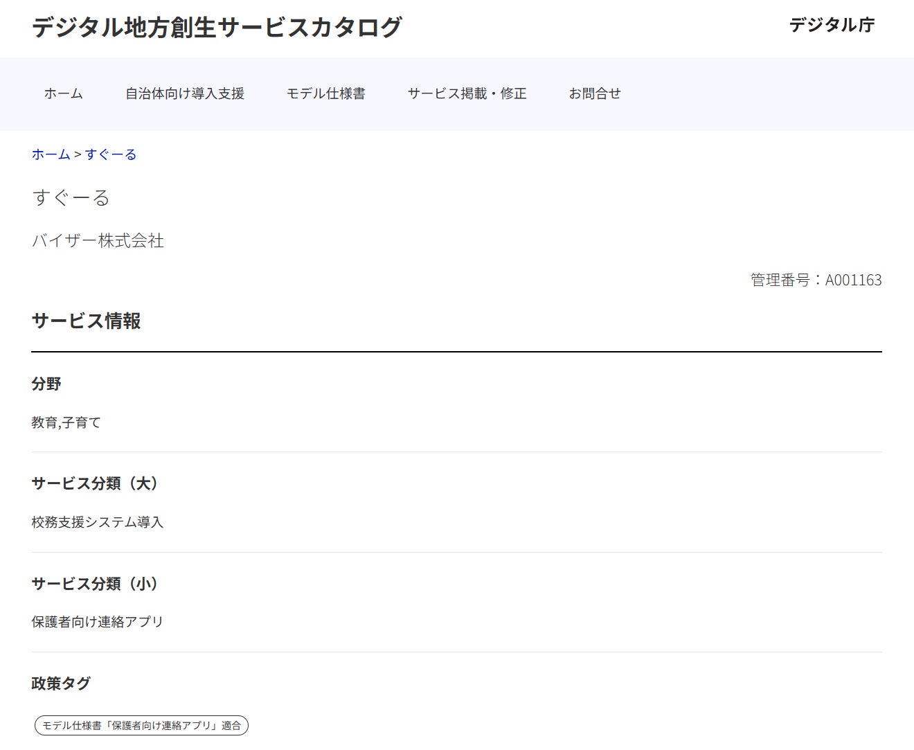 全国の自治体へ情報発信ソリューションを提供するバイザー株式会社(本社:愛知県名古屋市、代表取締役:中島 秀典)は、同社が提供する教育現場向け連絡システム「すぐーる」が、デジタル庁の「デジタル地方創生サービスカタログ」において、「保護者向け連絡アプリ」のモデル仕様書に適合するサービスとして掲載されたことをお知らせいたします。