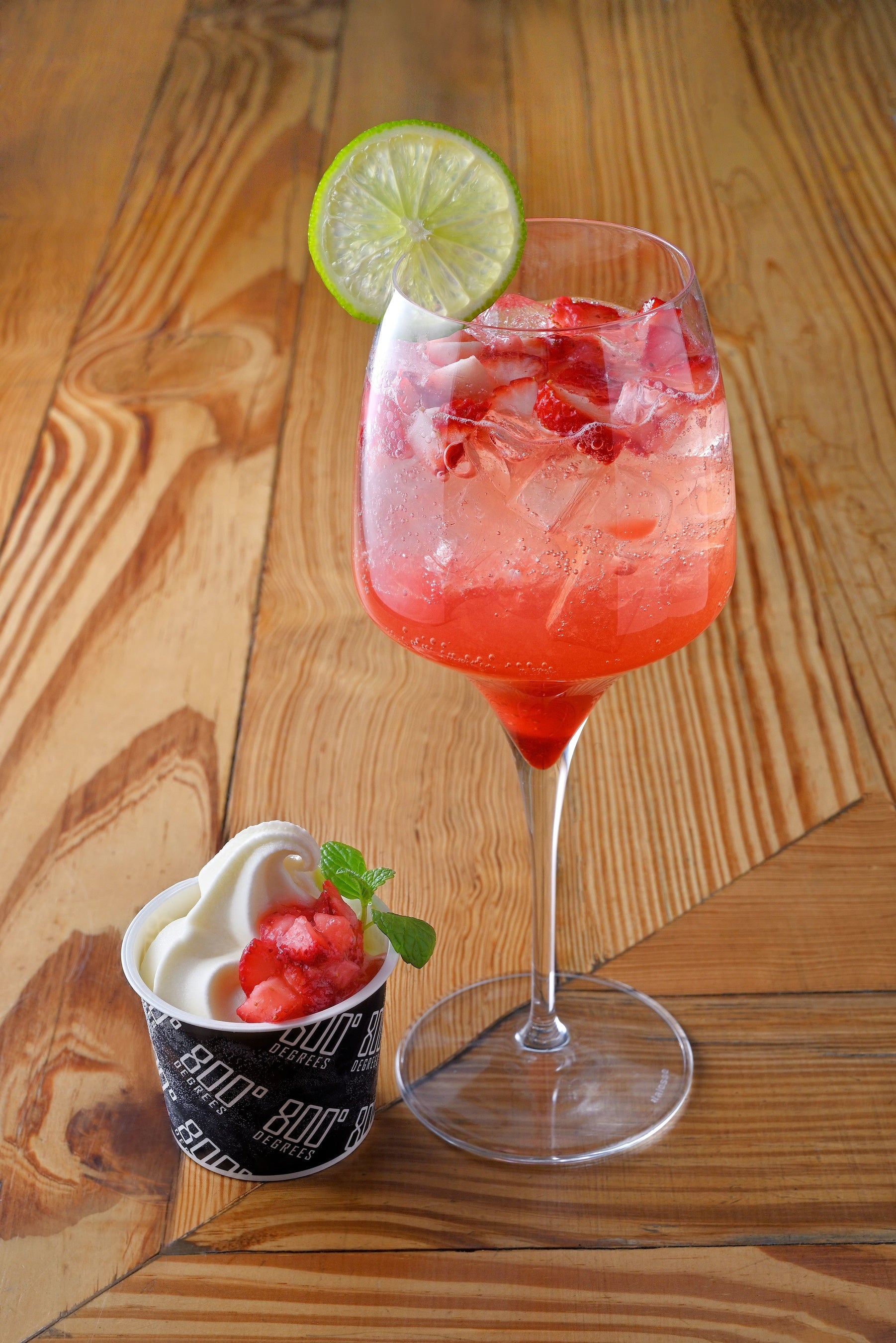 800° DEGREES NEAPOLITAN PIZZERIA 南青山店の定番スイーツ「フロマージュブランソフト」に、カットいちご(いばらキッス)を添えた「いばらキッスのフロマージュブランソフト」をどうぞ。(写真左)