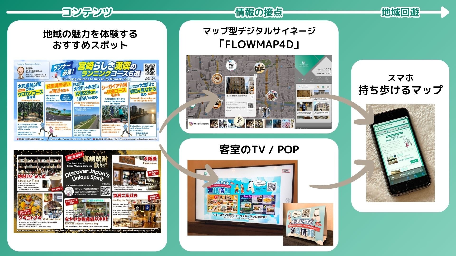 全国の「プリンス スマート イン」に導入されているマップ型デジタルサイネージ「FLOWMAP4D」には、地元の方がおすすめするスポット情報などが掲載されていますが、「プリンス スマート イン」ブランドの8店舗目となる宮崎より、宿泊者がデジタルサイネージのコンテンツをスマホで持ち歩けるシステムを新たなサービスとして提供開始いたします。