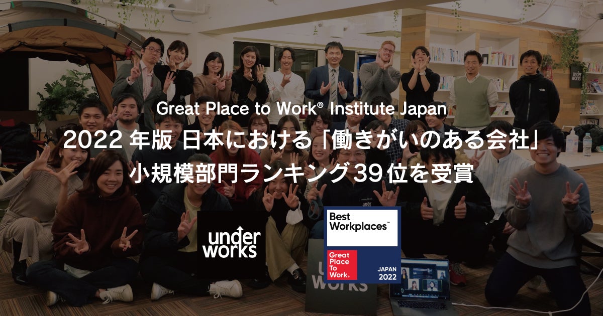 アンダーワークス株式会社(本社:東京都港区、 代表取締役社長:田島 学)は、世界60カ国7,000社を超える企業の働きがい調査を行うGreat Place to Work ® Institute Japan(以下、GPTWジャパン)が実施する2022年版日本における「働きがいのある会社」ランキング小規模部門にて39位を受賞しました。