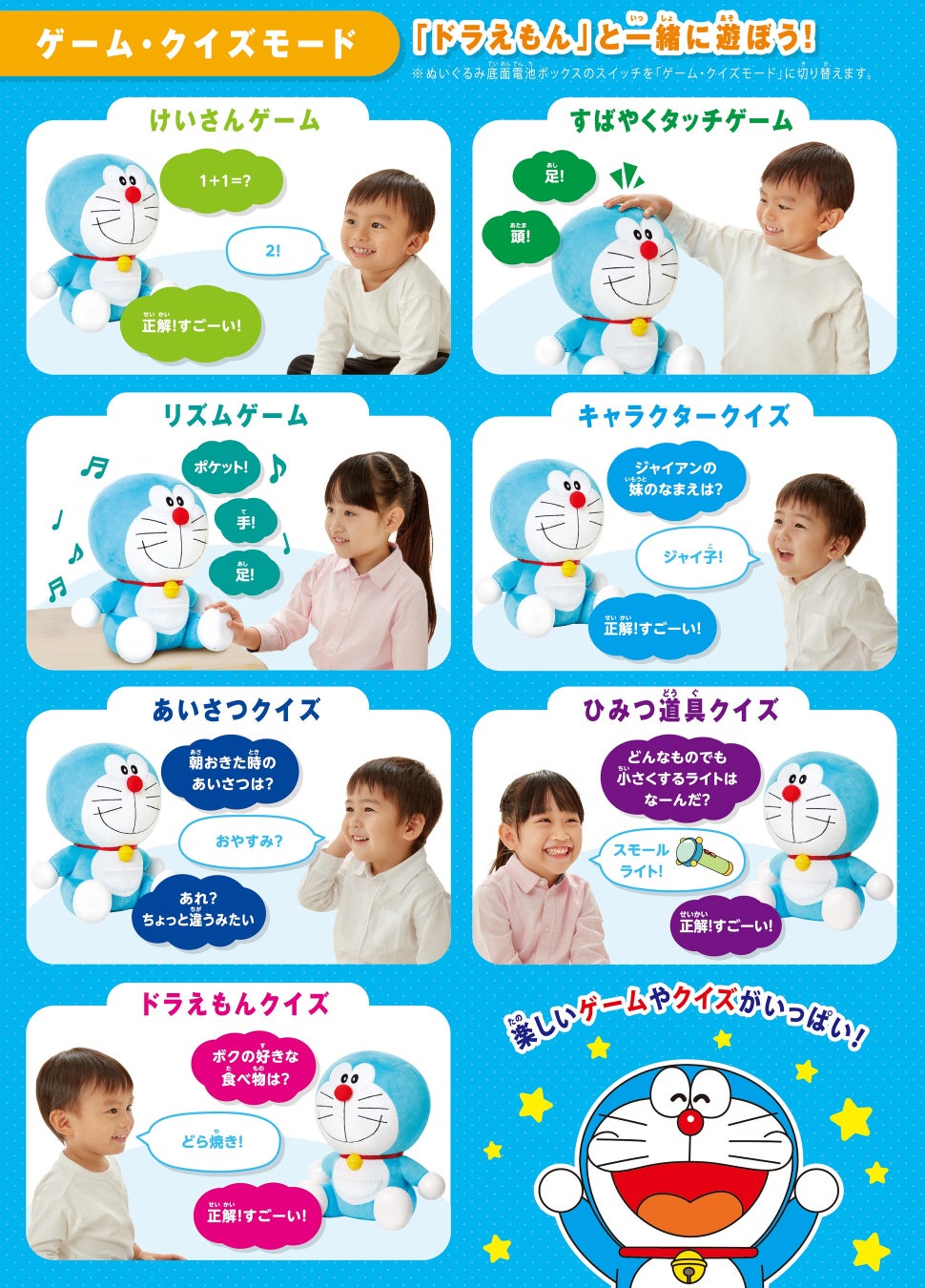 柔らかい素材で抱き心地も良く、ドラえもんとふれあいながら、遊びを通じて多くの言葉を学べるとともに、遊びの要素も備わった、長く楽しめる商品となっています。