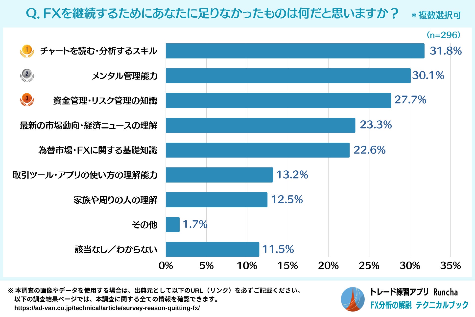 FXを継続するために足りなかったものについて質問したところ、最も多かった回答は「チャートを読む・分析するスキル」で31.8%、次いで「メンタル管理能力」で30.1%、「資金管理・リスク管理の知識」で27.7%という結果となりました。