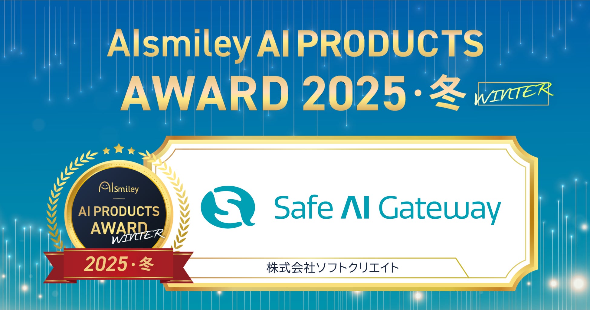 株式会社ソフトクリエイト(本社:東京都渋谷区、代表取締役社長:林 宗治、以下「ソフトクリエイト」)は当社が提供する、企業・団体向け生成AIサービス「Safe AI Gateway」が、株式会社アイスマイリー(本社:東京都渋谷区、代表取締役:板羽 晃司、以下、アイスマイリー)より発表された「AIsmiley AI PRODUCTS AWARD 2025 WINTER」において「ChatGPT連携サービス部門」を受賞いたしましたことをお知らせします。