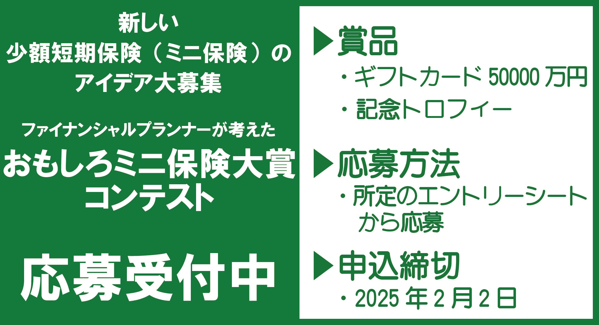 一般社団法人日本少額短期保険協会 (東京都中央区八丁堀 会長:花岡裕之 以下「当協会」)はファイナンシャルプランナーが考えた「おもしろミニ保険大賞」コンテストの受付を開始いたします。