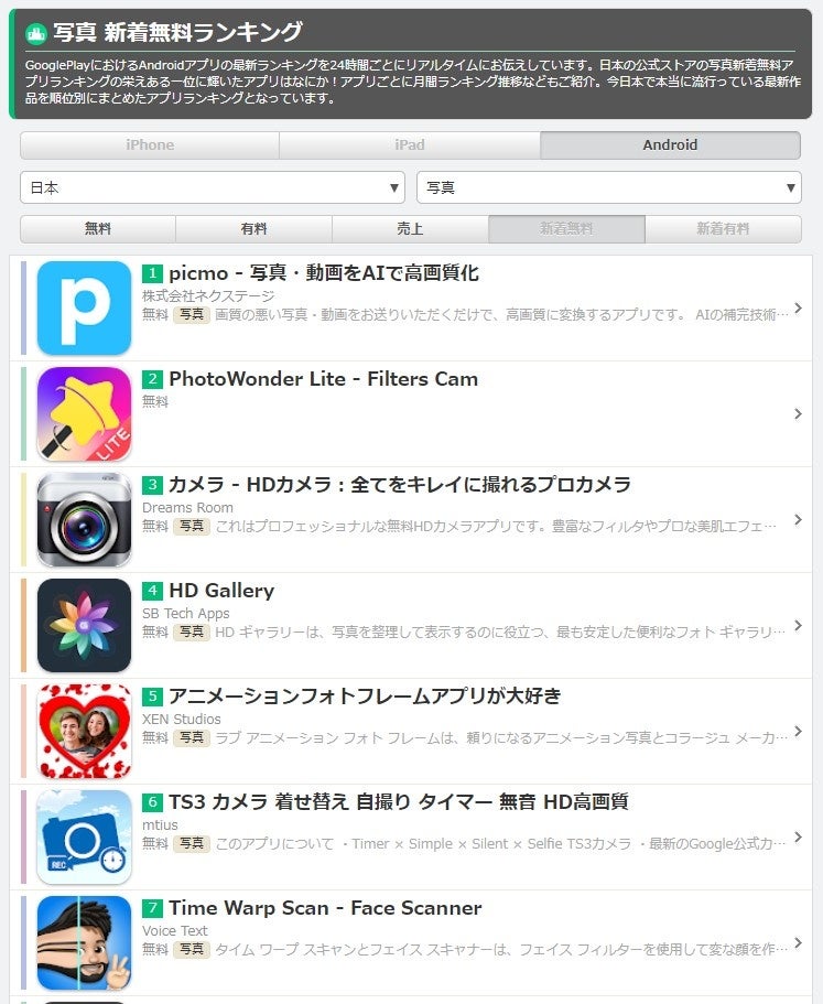 ●APPLION「写真 Androidアプリの新着無料ランキング」