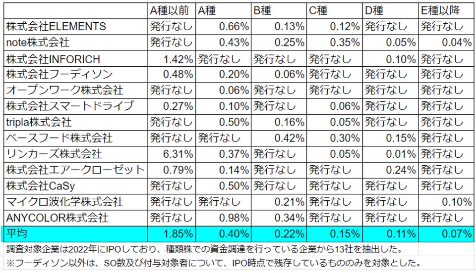 2022年に東証グロース市場にIPOを行った91社から時代を反映する13社を選定し、有価証券報告書より種類別に付与した1名あたりストック・オプション比率を算出し、その結果を今回9月19日にリリース致しました。