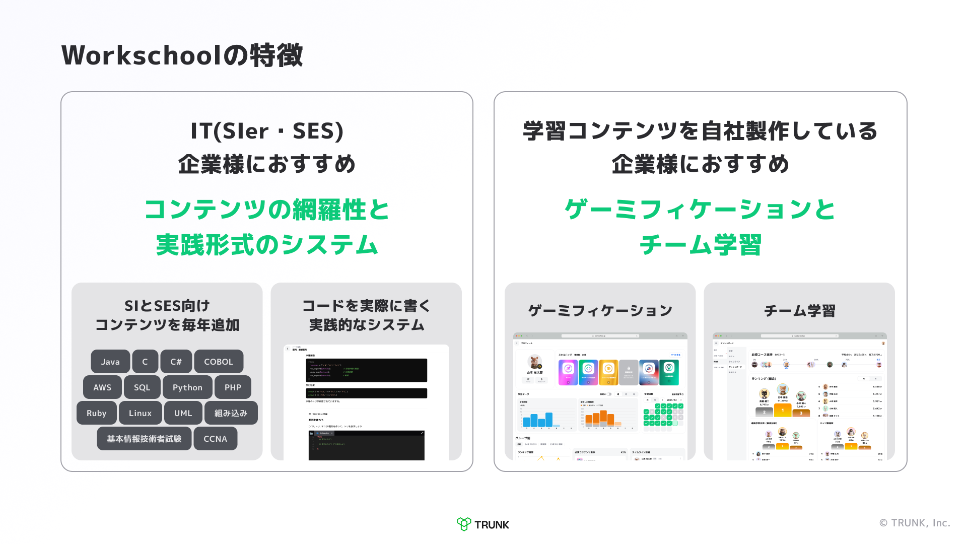 TRUNKは「学びを、やるものから、やりたくなるものへ。」を掲げ、企業向けに研修の運用・学習管理を支援するe-Learningシステムを提供しています。