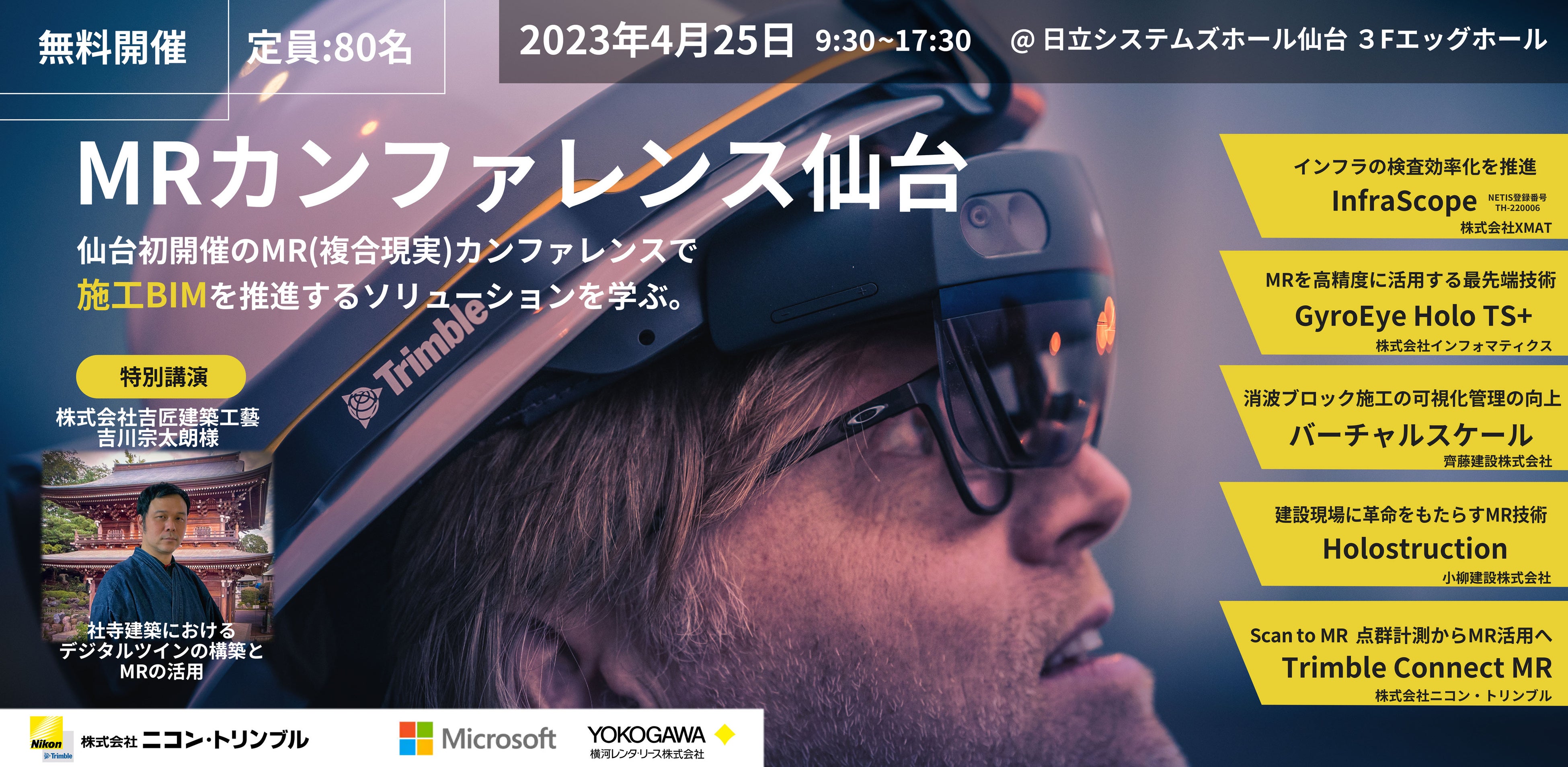 2023年4月25日、測量・測位ソリューションの開発・製造・販売を行う株式会社ニコン・トリンブル(本社:東京都大田区、代表取締役社長兼CEO:丹澤孝)は、「建設業のDX化を支援するMR技術」をテーマに現場の課題解決に直結する各種アプリケーションを仙台に結集、開発企業様のセミナーと体験空間を設けた「MRカンファレンス仙台」を開催いたします。