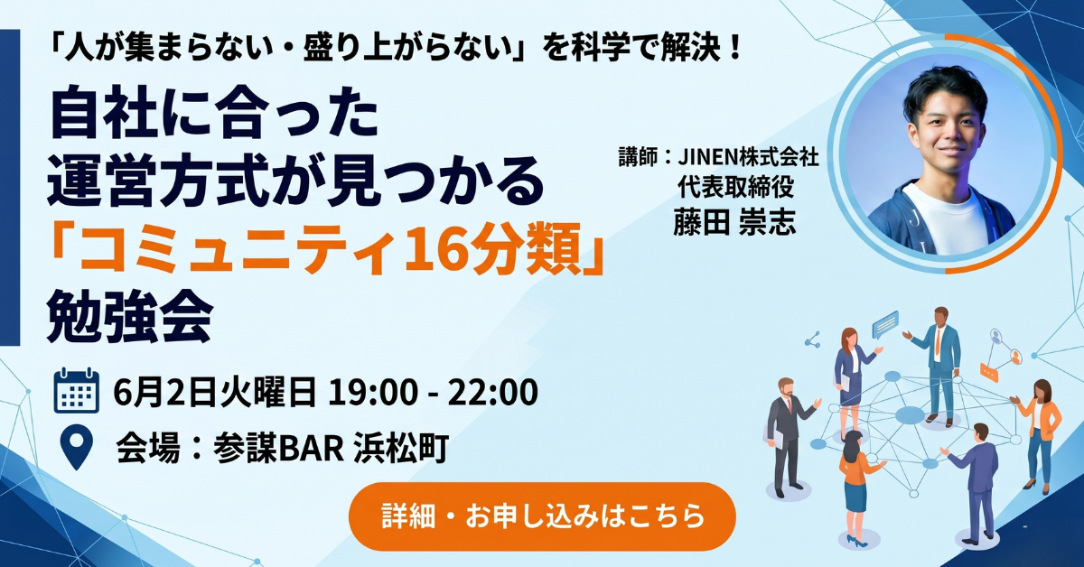 経営者コミュニティ「参謀」を運営する株式会社経営参謀(本社:東京都新宿区、代表取締役:新谷 健司)は、2026年6月2日(火)に「人が集まらない・盛り上がらない」を科学で解決する「コミュニティ16分類」勉強会を開催します。JINEN株式会社 代表取締役の藤田崇志氏を講師に迎え、学術的エビデンスに基づくコミュニティの4象限16分類を学び、自社に最適なコミュニティの設計・運営方式を習得する実践型セミナーです。