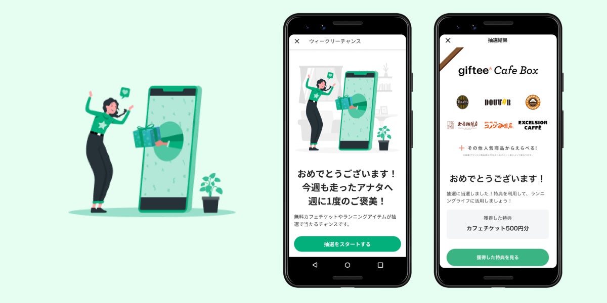 毎週100マイル(10km相当)を獲得すると「Runtripウィークリーチャンス」の抽選チケットが付与されます。この抽選ではラントリップが厳選したランニングアイテムや、有名チェーンのカフェギフト、ドーナツやアイスクリーム、旅行商品など、さまざまご褒美が特典として提供されます。