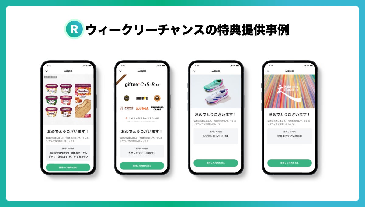 「Runtripマイレージプログラム」では毎週100マイル以上貯めると、翌週月曜日から「Runtripウィークリーチャンス」において様々な特典が当たる抽選に参加できます。特典は¥500分の有名チェーン店のカフェチケットや、有名ブランドのドーナツ・アイスクリーム引き換えチケットなどの「ご褒美」系から、有名ブランドのランニングシューズ等の週替わりでの目玉アイテムもリリース依頼毎週提供しております。その結果「Runtripウィークリーチャンス」の特典提供数は2023年4月1日時点で累計45,311件となりました。