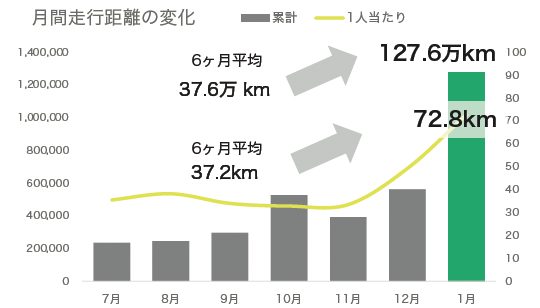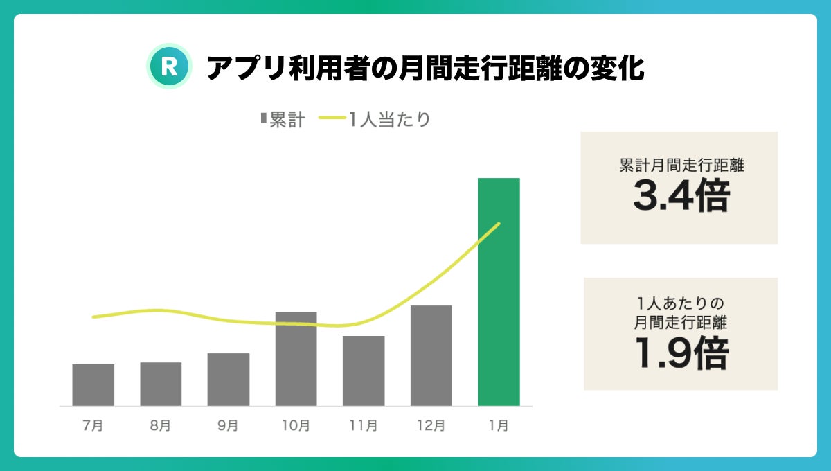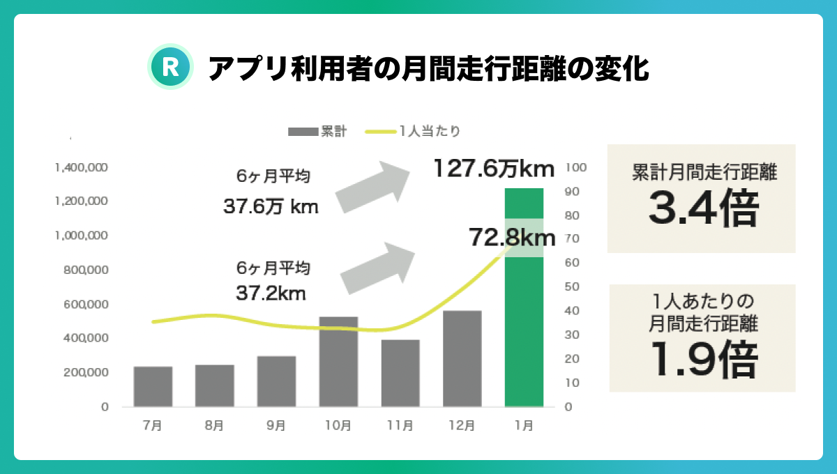 1)Runtripアプリを利用した累計走行距離が3.4倍に