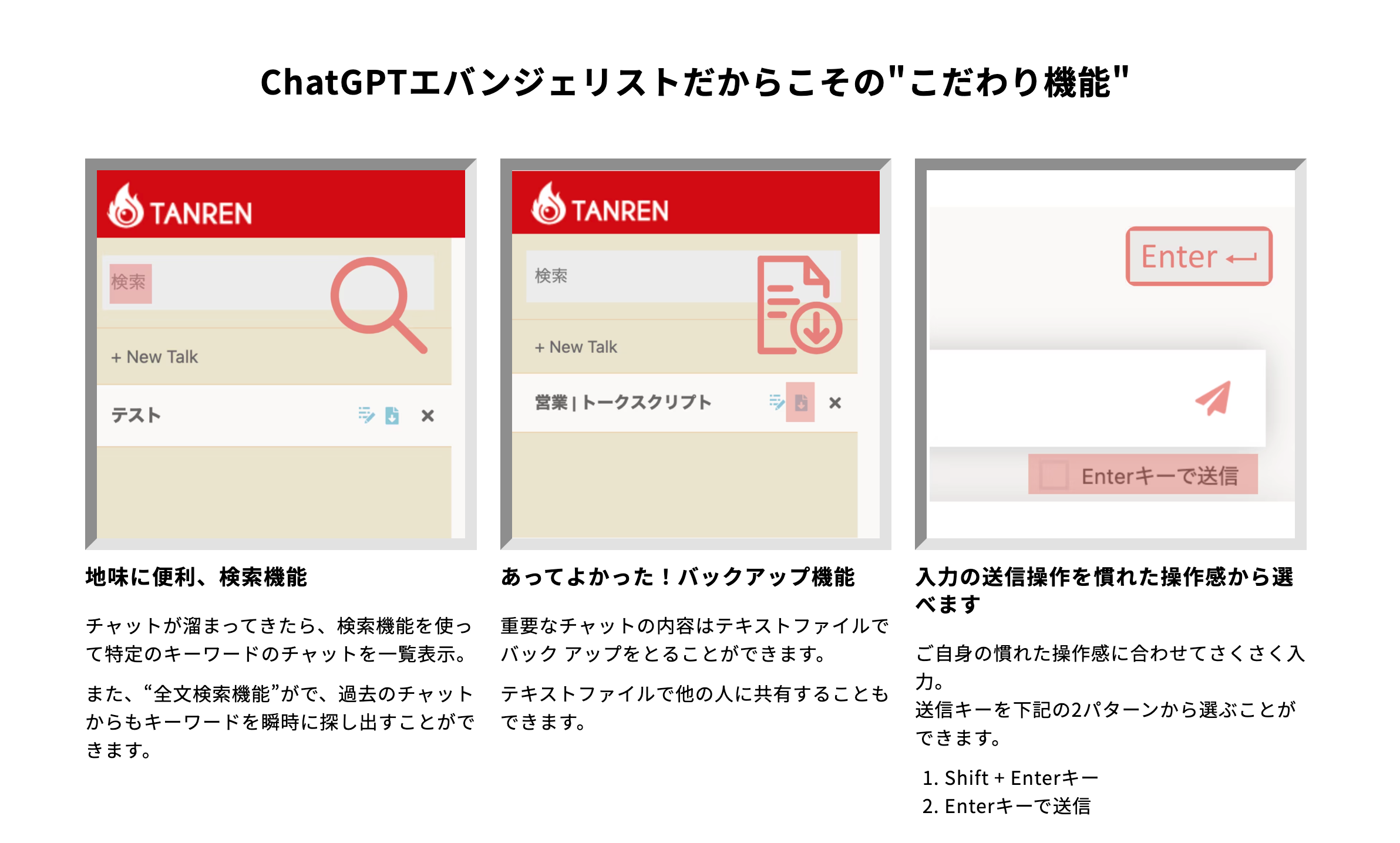TANREN CHATは、GPT-3.5だけでなく、より高性能なGPT-4もサポートしています。これにより、ユーザーは、それぞれのニーズに最適なAIモデルを選択することができます。また、UI/UXは、既存のChatGPT サービスに慣れたユーザーが戸惑わないように、操作体系はほぼ同一にした上で、細部にこだわりの追加機能を入れたことで、最高のユーザーインタフェースが提供されています。
