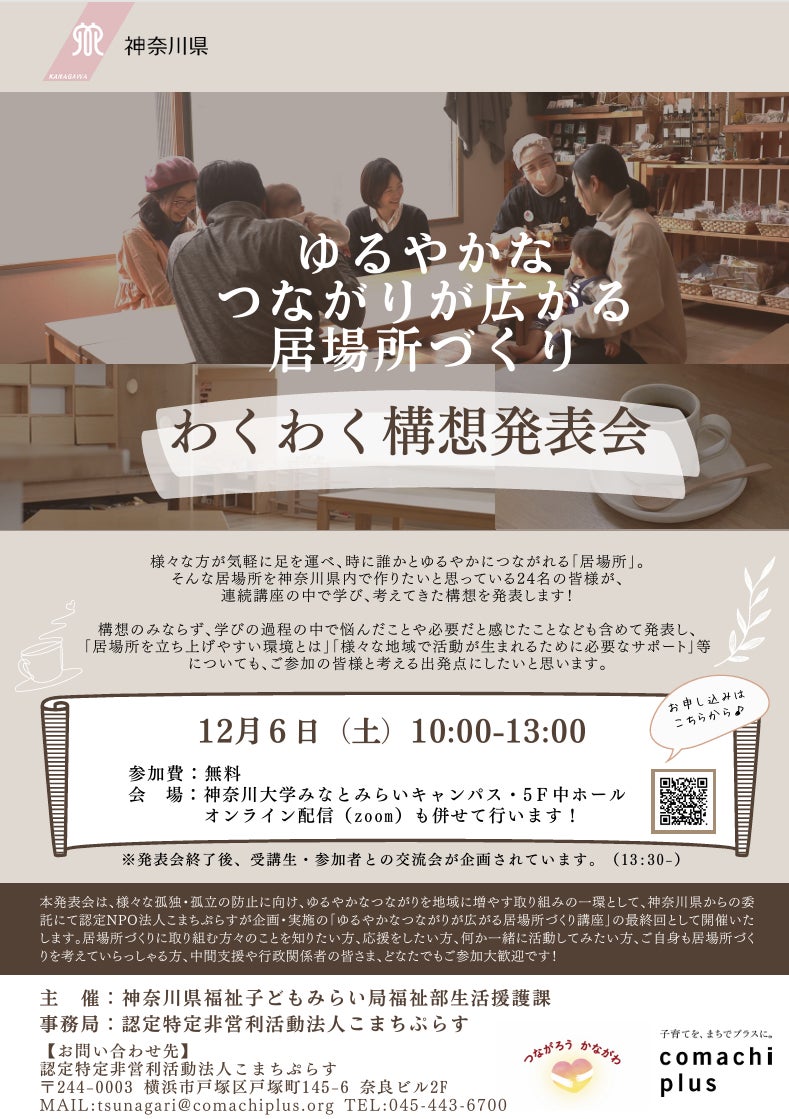 その中で、今年の9月より、様々な孤独・孤立の予防に向け、ゆるやかなつながりを地域に増やす取り組みの一環として、神奈川県からの委託にて認定NPO法人こまちぷらすが企画・実施の「ゆるやかなつながりが広がる居場所づくり講座」を開催してまいりました。
