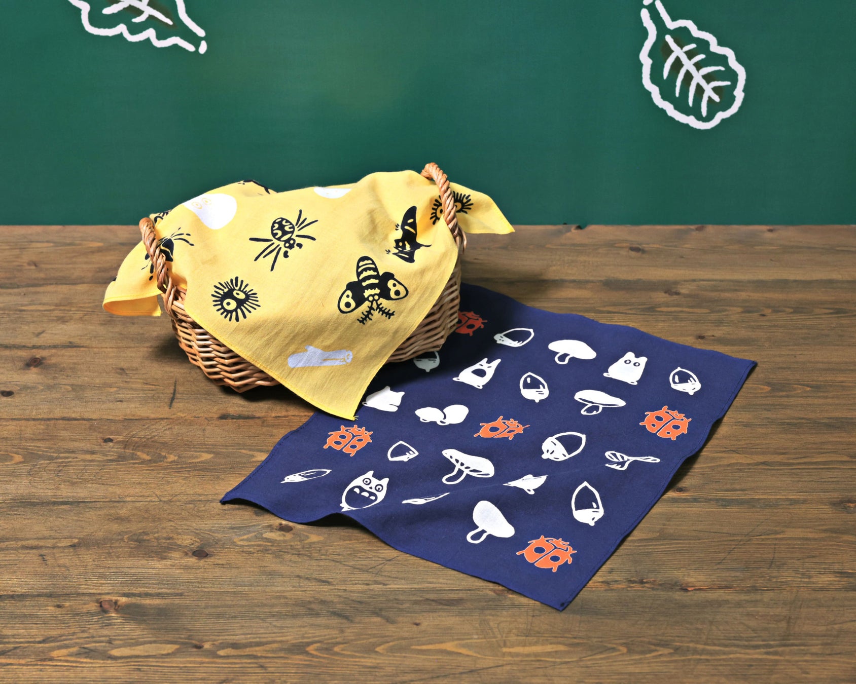 「となりのトトロ」のオープニングとエンディングをモチーフにしたてぬぐいハンカチです。伝統技法「注染」を生かし、奈良の注染工房と作りました。