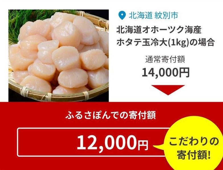 「ふるさぽん」では一部返礼品について、下図のように分かりやすく「寄付額」と「通常寄付額(自治体が一般的に募る場合の寄付額)」を表示しています。これにより、ふるさと納税の初心者でも面倒な比較検討をすることなく、安心して寄付ができます。なお、本表示に際して、当社は事前に総務省へ確認を行っています。