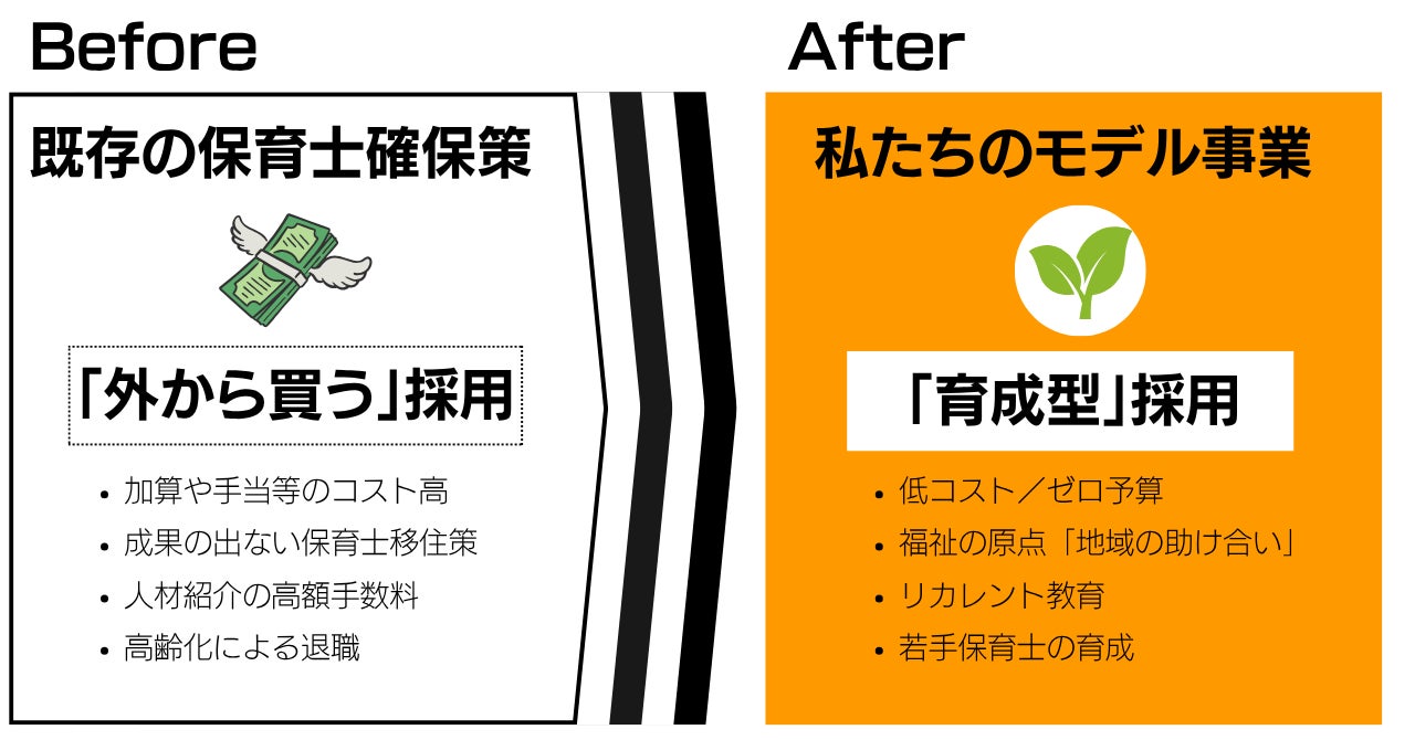 これまで多くの地域が、都市部から人材を呼び込もうと試みてきました。しかし、本質的な解決にはならず、多くの保育施設が高額な手数料を人材紹介会社に支払い、疲弊する園は後を絶ちません。