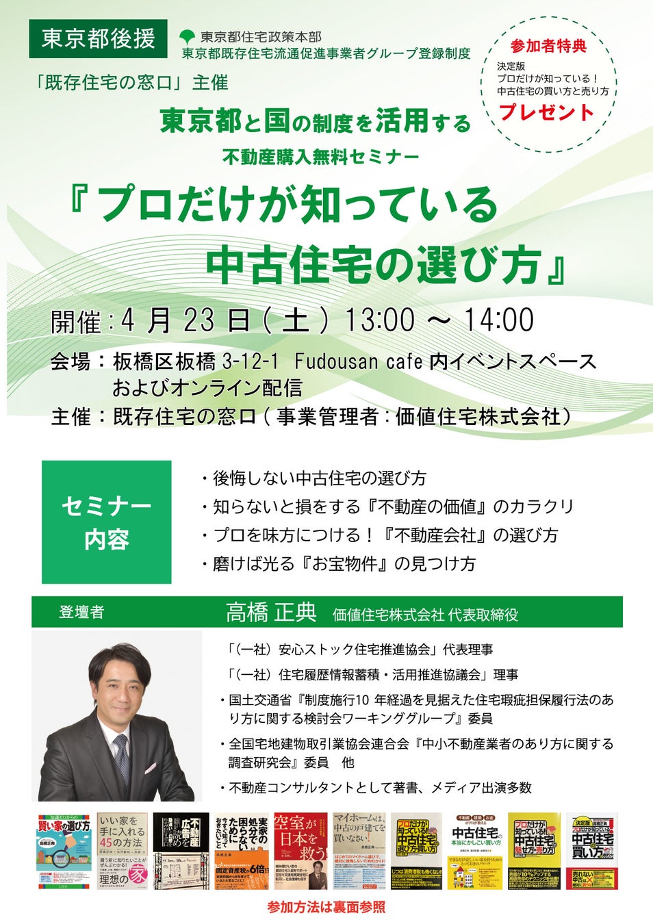 価値住宅株式会社(本社:東京都渋谷区/代表取締役社長:高橋正典、以下価値住宅)は、同社が事業管理者として登録される東京都既存住宅流通促進登録事業者グループ「既存住宅の窓口」にて、既存住宅購入における検査や保険の重要性ついてのセミナーを2022年4月23日(土)24日(日)に開催することをお知らせします。