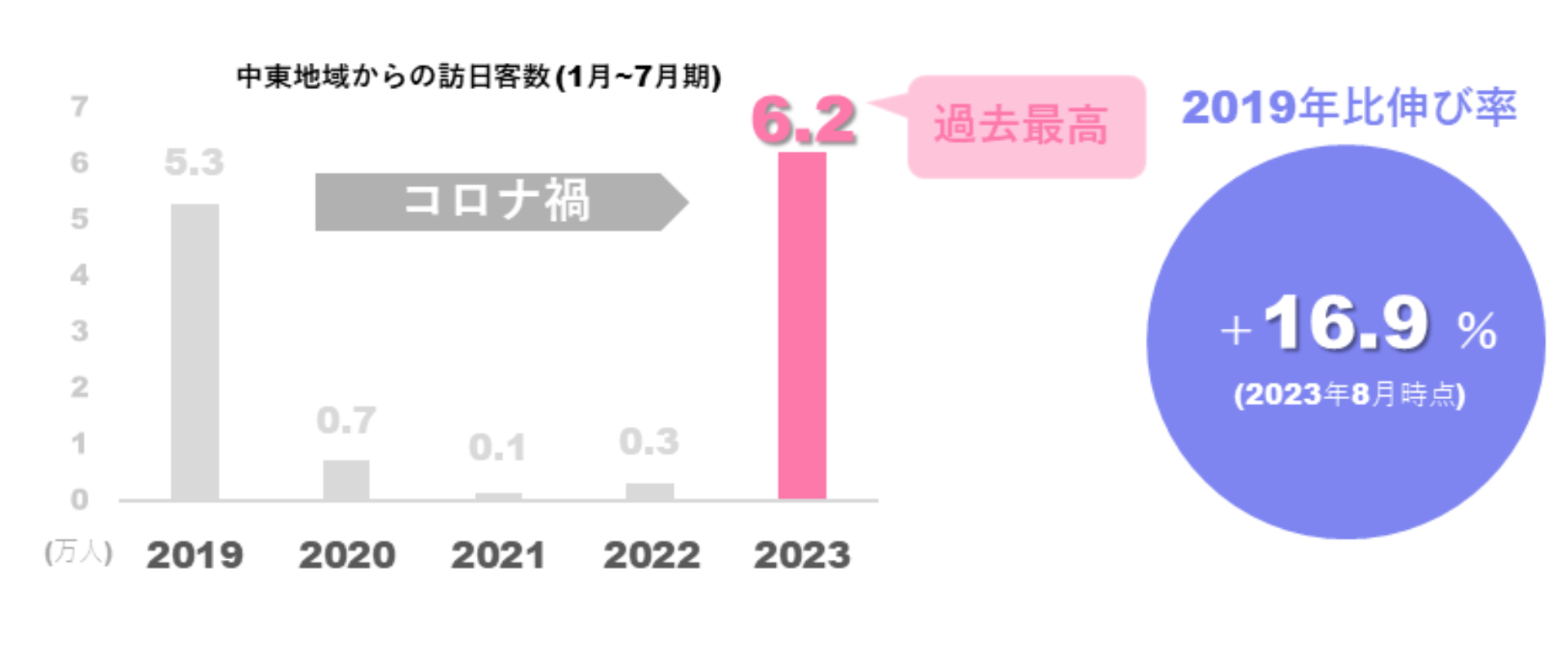 日本政府観光局(以下、JNTO)が発表している『中東地域市場外国旅行の動向』によると、GCC各国の外国旅行需要は、2028年まで増加すると予測されています※3 。GCC各国を含む中東地域※4の訪日旅行者数の年別推移は2016年の6.7万人から2019年には9.5万人と年々順調に増加しています。また、2023年8月時点の2023年1月から7月期の推計データによると、中東地域からの訪日客数は過去最高の6.2万人を記録しています。2019年同時期対比(2019年は5.2万人)で伸び率は+16.9%と、シンガポールやフィリピンに次ぐ3位の伸び率で、非常に勢いがあります※5 。中東地域の訪日客数の増加に伴い、2020年度より、JNTOと観光庁は訪日プロモーション事業の実施対象となるビジット・ジャパン重点市場に中東地域を新たに追加しました。中東市場のプロモーションを強化することにより、訪日旅行者数のさらなる増加と消費額の拡大が期待されています。※6