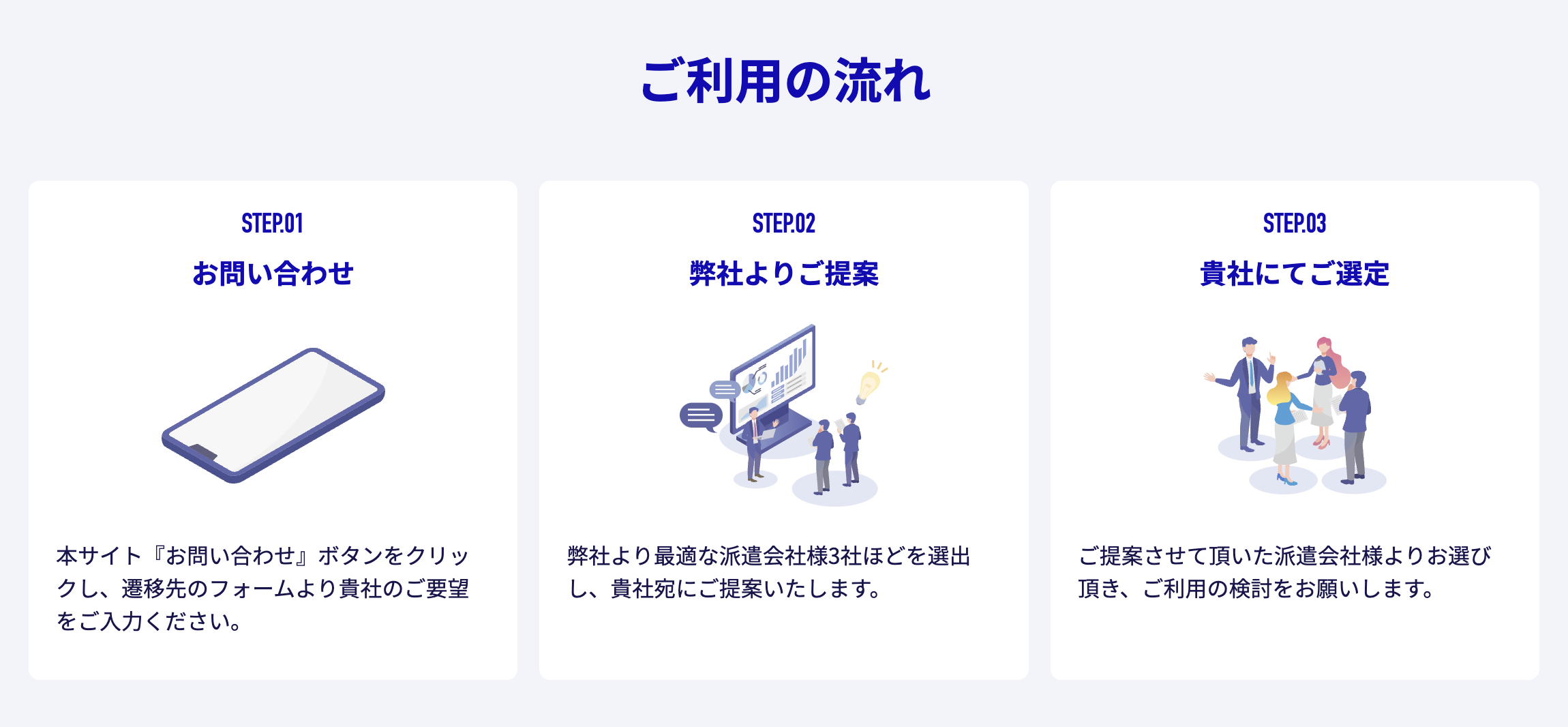 「派遣ミーツ」は、全国1万社を超える派遣会社の中から、コスト・地域・業種の各種要件に応じて最適な派遣会社をGuidableが製造業・物流業の企業にご提案します。「問い合わせ」で希望する人材の要件をフォームにご入力いただくと、内容に応じてGuidable担当者から候補となる派遣会社を3社前後に厳選してお送りします。企業はリストをもとに「派遣会社の選定」を行うだけの3ステップで、最適な派遣会社とマッチングすることが可能です。