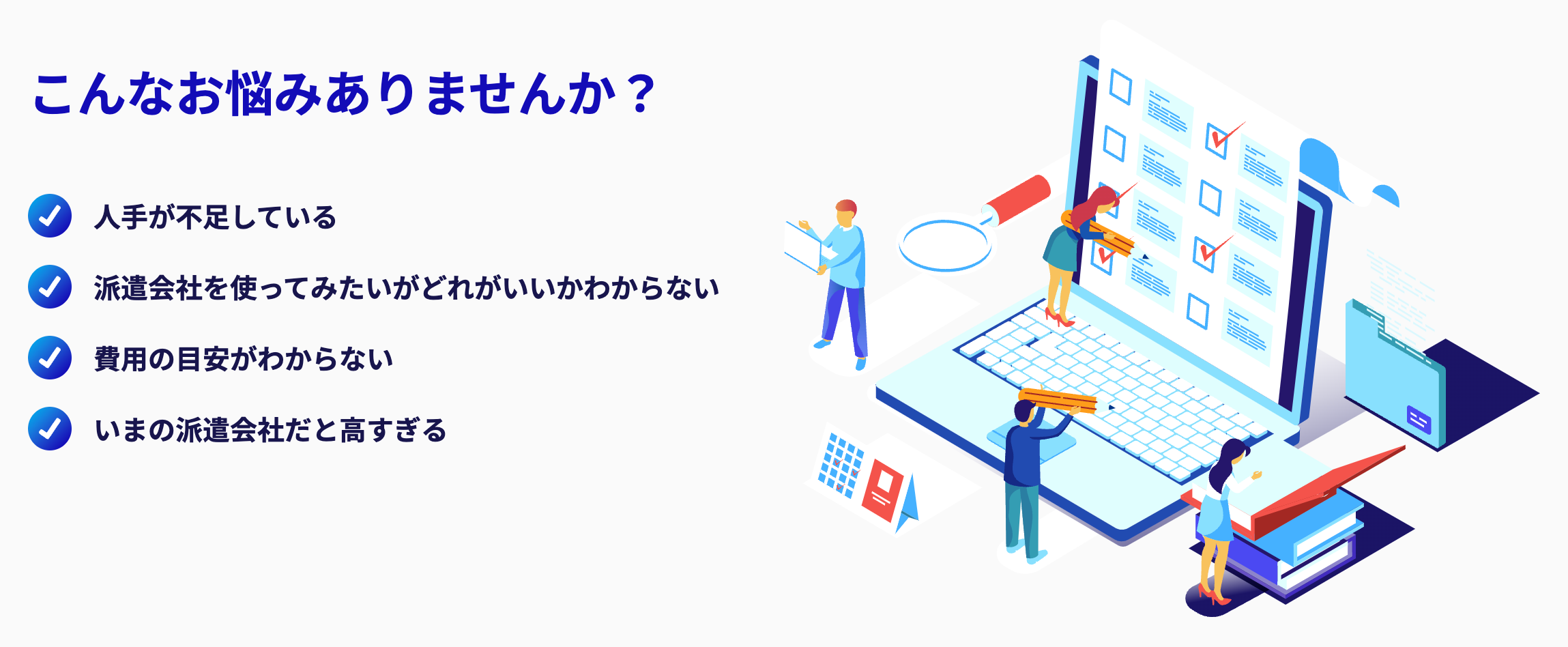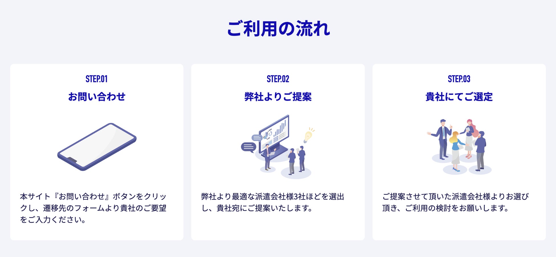 (求める職種や採用人数、月給イメージから、最適な派遣会社を厳選してご提案します)