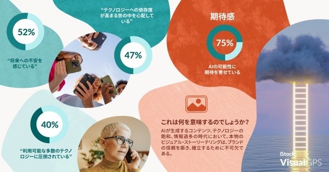 技術の進歩と将来への不安が支配する世界で、昨年1年間を通して、消費者の不安は高まりました。iStockの調査によると、52%が将来への不安を感じており、47%がテクノロジーへの依存度が高まる世の中を心配しています。特に、40%が利用可能な多数のテクノロジーに圧倒されていると感じています。しかし、こうした懸念の一方で、75%の人が人工知能(AI)の可能性に期待を寄せていることも分かりました。