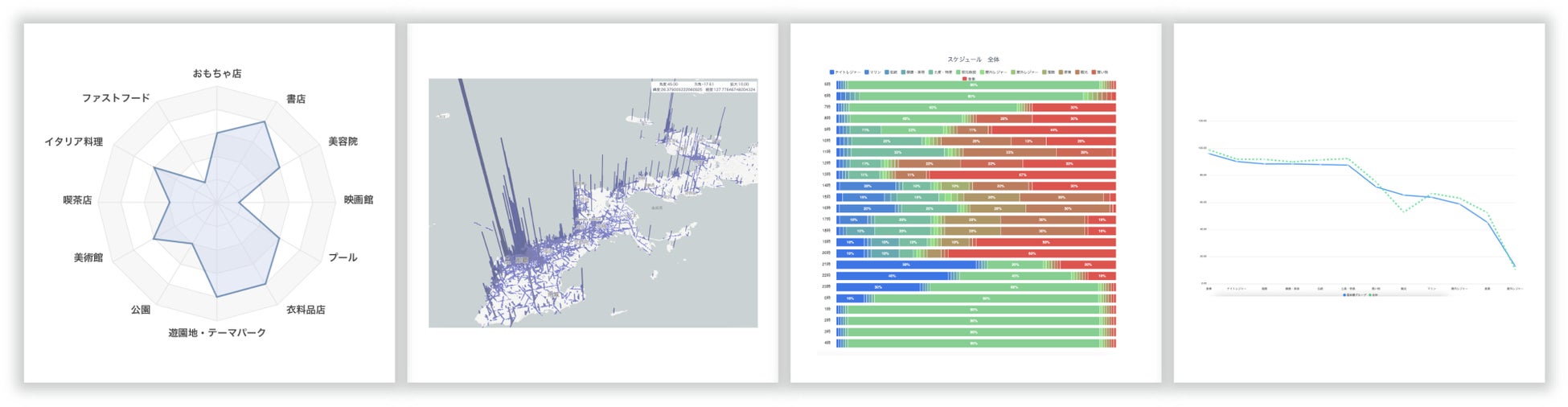 国内最大規模の数を誇るドコモ契約者の位置情報(別途同意を頂いた方)に対してスポット情報を掛け合わせ、特許技術による独自のクラスタリング処理を行うことで、趣味嗜好・行動パターンの類似性からユーザー群を任意の複数グループに分類した統計データを生成。基地局データの膨大なサンプルサイズと連続性により、個人を特定することのない統計データでありつつ、詳細で高精度なペルソナ分析が可能となっています。