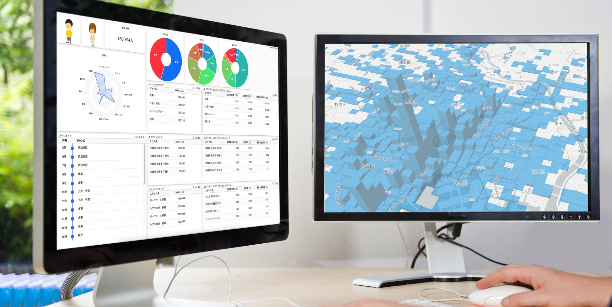 指定エリアにどのような人が訪れどこでどのように行動しているかの、毎月、毎年の変化を定期的に計測することによって、観光分析、街づくり、店舗開発、テナント誘致、イベント分析、取扱商品選定、集客プロモーション、リピーター獲得策、客単価の向上策などの検討、および、それらの効果測定にご活用いただけます。