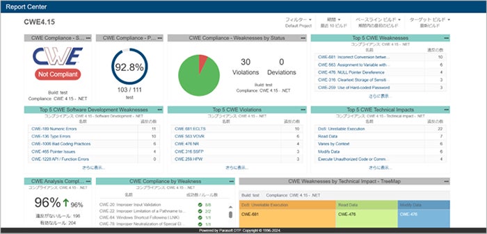 セキュリティ関連ルールにおいては、ソフトウェアの脆弱性を識別するための脆弱性の種類(脆弱性タイプ)の共通脆弱性タイプ一覧であるCWE(Common Weakness Enumeration)のver.4.15に対応した静的解析を行うことが可能になりました。専用のダッシュボードとウィジェットを利用して静的解析の結果をPCI DSSやOWASP、CWEなどの基準のリスクスコアリングにマッピングすることで、各基準に則った遵守サマリーレポートや逸脱のレポートをいつでも確認できるようになりました。