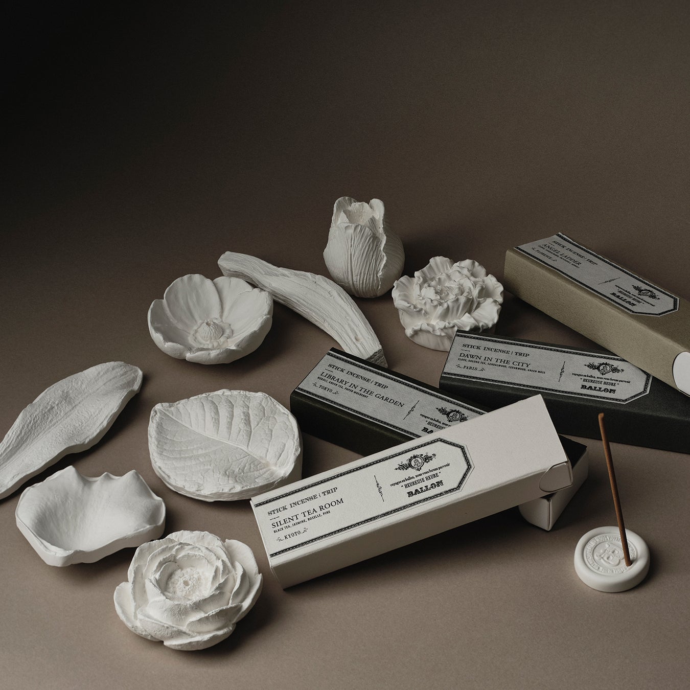 BALLONは2009年のデビュー以来、「アンティーク」の静謐な世界観とアロマの静かな空気感を表現した石膏でできたアロマオーナメント®を中心とした様々な商品を発表。