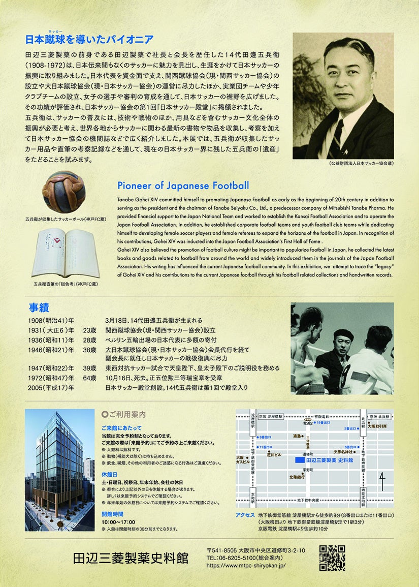 田辺三菱製薬の前身である田辺製薬で社長と会長を歴任した14代田邊五兵衞(1908~1972年、以下「五兵衞」)は、はやくは大正時代にサッカーの魅力を見出し、生涯をかけて日本サッカーの振興に取り組みました。その功績が評価され、2005年には日本サッカー協会の第1回「日本サッカー殿堂」に「日本サッカーの発展に顕著な功労者」として選出されました。史料館内に設ける企画コーナーでは、日本サッカーの出来事と五兵衞の主な事績に関する年表とともに、五兵衞の自筆資料やゆかりの品を展示し、日本サッカーと五兵衞の歩みをたどります。