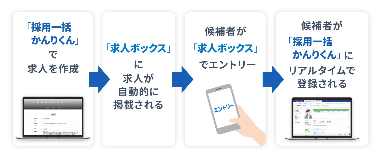 これにより「採用一括かんりくん」で作成した求人が、自動で「求人ボックス」に掲載されるようになり、さらに「求人ボックス」で応募があった場合は「採用一括かんりくん」に自動で登録されます。