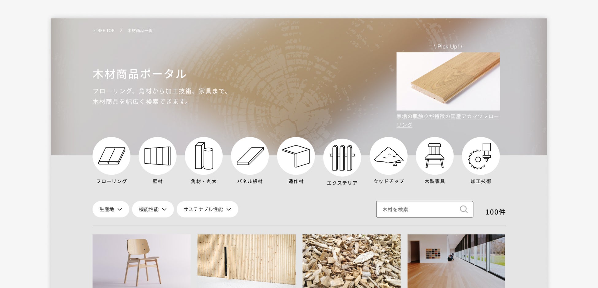 このような課題を解決するために開発されたのが「eTREE木材商品ポータル」です。本サイトは『木材商品を探すなら、一番わかりやすいWebサイト』をコンセプトに、全国の木材商品・木質建材を掲載・紹介するWebサイトです。