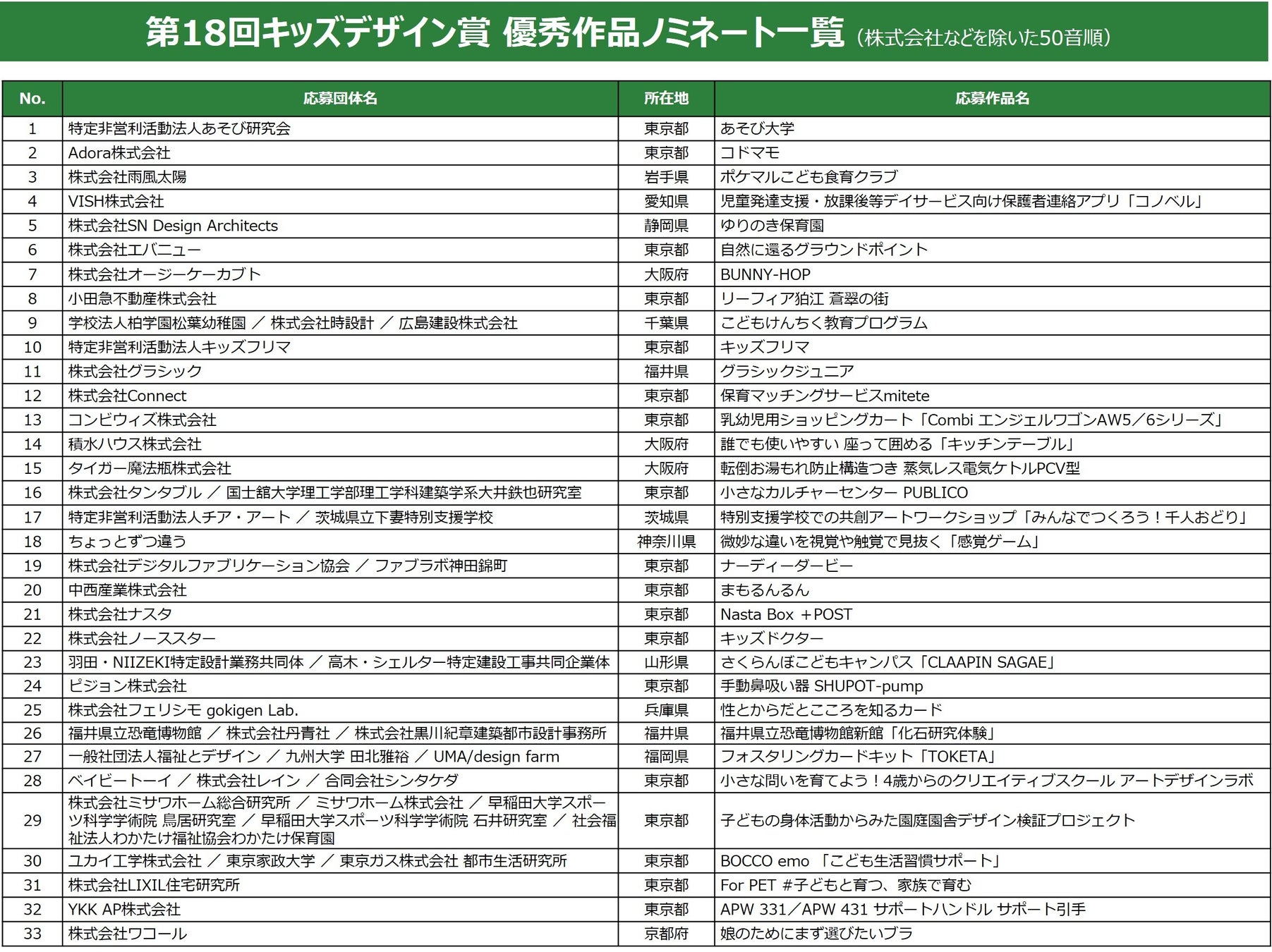 第18回キッズデザイン賞受賞作品237点の中から選ばれた優秀作品へのノミネート33点を本日発表!