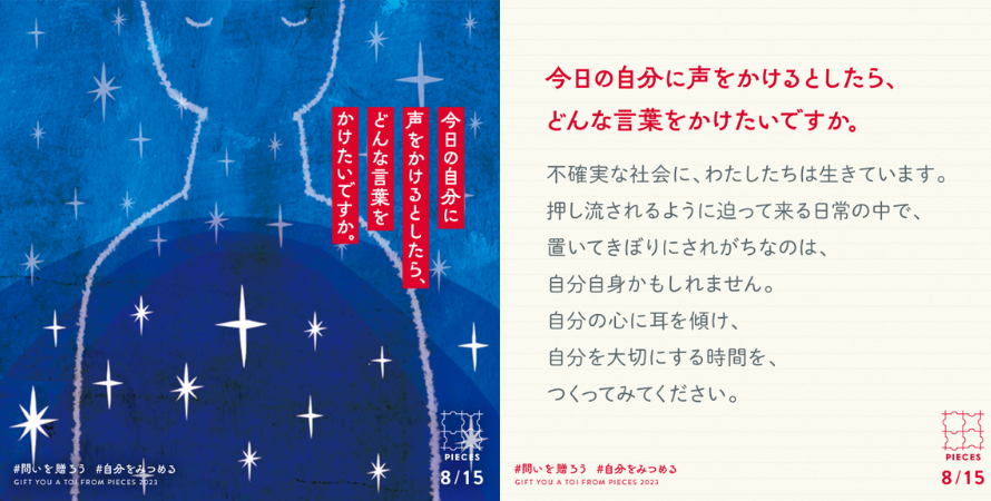 今年はPIECESから17個の「問い」を贈り、より多くの人が自分自身や周りの人、社会や未来に向き合うことで、誰もが大切にされる社会を目指すきっかけをつくります。