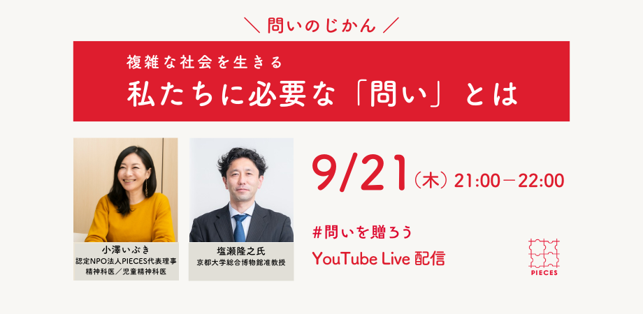 『問いのデザイン 創造的対話のファシリテーション』の著者であり、「問い」のプロフェッショナルである塩瀬隆之さんをゲストに迎え、PIECES代表理事の小澤いぶきと共に「問うこと」そのものを深めます。